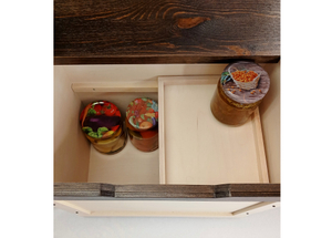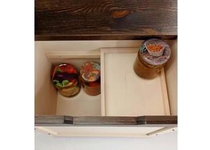 Передняя крышка легко открывается, превращаясь в удобный столик для чашечки ароматного кофе или чая. Внутри просторное отделение позволит хранить джезву, чашки для кофе ,чая, чайники, сахарницы и прочие аксессуары для кофейной церемонии. В верхней части ларца расположен второй отсек.