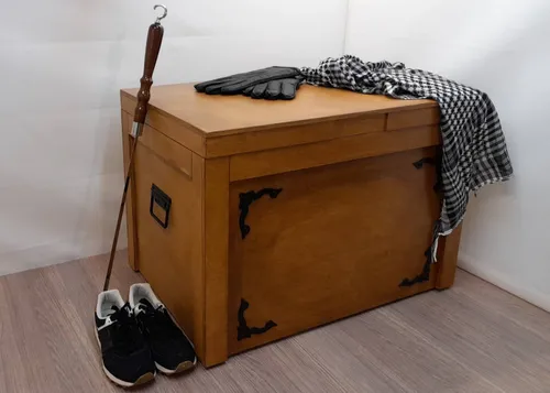 Пристенный сундук-амуничник это сундук более сложной конструкции. По сути является небольшим шкафом с раздельными отсеками, съёмными ящиками и крючками, дополнительно выполняющий функции стола или сиденья. Спроектирован специально для установки вплотную к стене.